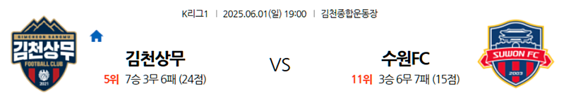 2025년 5월 31일 19:00 (한국 시간) | 김천 종합운동장 (Gimcheon Sports Complex), 김천 | K리그1 | 김천 상무 vs 수원 FC