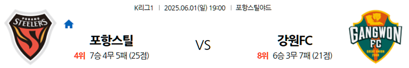 2025년 5월 31일 19:00 (한국 시간) | 포항 스틸야드 (Pohang Steel Yard), 포항 | K리그1 | 포항 스틸러스 vs 강원 FC